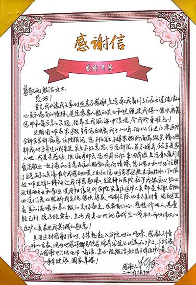 首先我代表我全家对您表示感谢,在您身上我看到了白夜天使纯洁的心灵和高尚的情操,是您像家人般的关心和照顾,使我得以很快康复,您那和蔼可亲的笑脸,经常在我脑海中浮现,令我终身难忘!