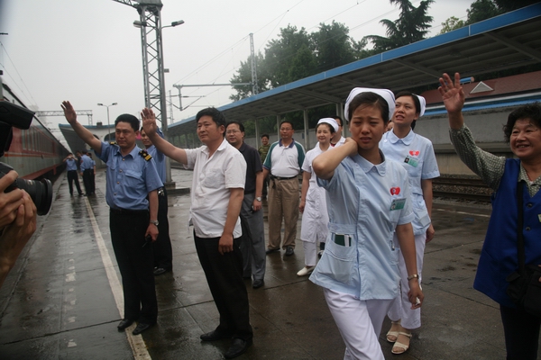 道不尽的依依惜别,说不完的浓浓情意——经过我院医护人员20天的精心治疗和护理,首批6名四川地震伤员于乘坐17日中午1点的火车康复出院,踏上返乡旅途。
